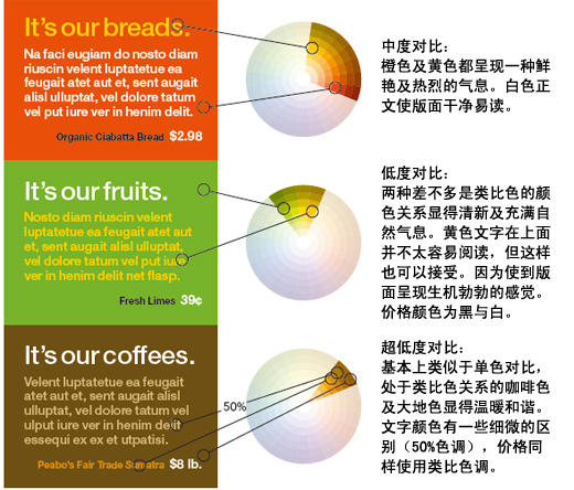 通過對文字的設色,使其與單一顏色的背景形成對比及傳達更富生命力的效果。這里的顏色規則同樣適用,可以象圖片一樣選擇顏色搭配。