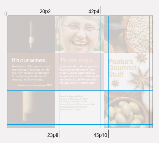 簡單的網格線:將版面水平及垂直分成九個相同的區域即可。三折頁的折疊方式可以是風琴折或信紙折,我們將這些區域稱為方塊區域,雖然嚴格來說,它不是正方的。